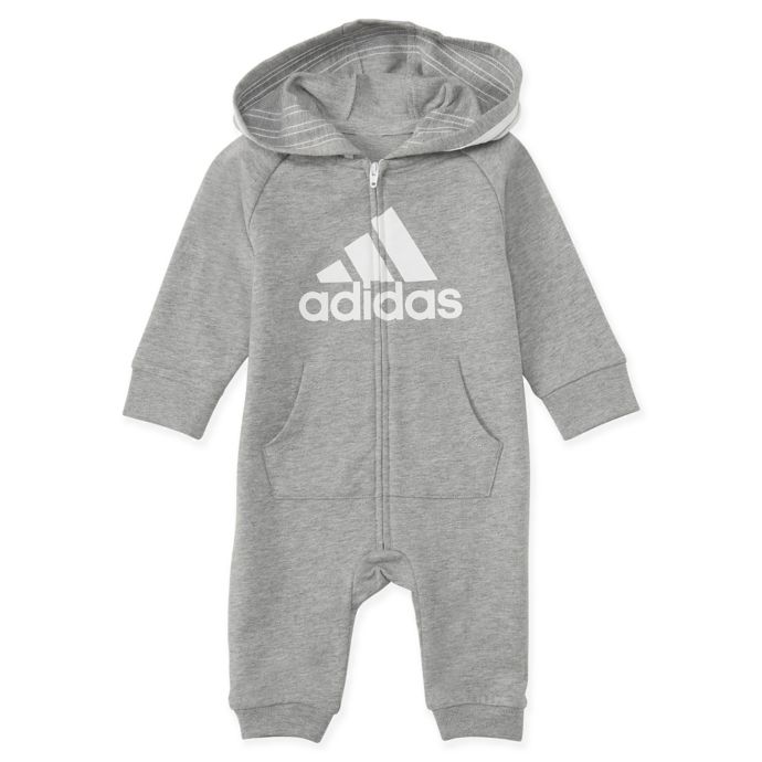 Get your little athlete ready to rock with this cute grey Coverall from adidas. The hooded outfit features raglan sleeves and a split kangaroo pocket, perfect for a fun day at the park or just a lazy day in the backyard.