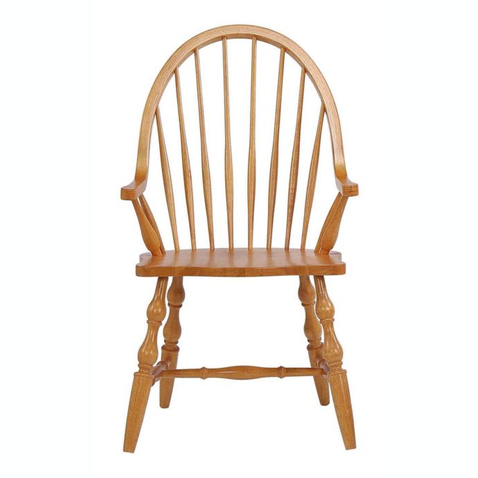 Windsor chairs are famous for their uncomplicated and universal design. Transform a kitchen corner into a cozy breakfast nook with these open and airy spindle back chairs. The seat has a saddle shape to assure maximum comfort with arms that give just the right support, yet slightly short, enabling you to sit down and get up with ease. Constructed from solid eco-friendly Malaysian oak, this farmhouse chic armchair is truly timeless and looks fantastic when paired with other dining room furniture pieces. Includes One bowed spindle back dining chair with arms Floor protectors Suitable for residential or commercial use. One year warranty against manufacturer defects. Disclaimer - Studio photography lighting, slight measurement and weight variances are possible, your viewing device may display colors differently than in real life. The product you receive may vary slightly from the image portrayed. Decorative items in photo not included. Product Care - Clean with light furniture polish, wipe with dry, lint-free cloth. Assembly - Arrives at your home fully assembled. Constructed from solid kiln dried Malaysian Oak also known as rubberwood.Product Dimensions - 25"L x 23.5"W x 41"H. Product Weight - 21 lbs. Finish/Color - Distressed Light Oak Main Product Material - Malaysian Oak. Product Category - Dining Chair Attractive arched back with varied height spindle rods that flow to the chair arms. Comfortable sculpted seat. Turned angled legs ensure stability on any floor type. Strong bolt together design Country of Origin - Malaysia. Warranty - 1 Year Limited Manufacturer Warranty Residential Use - Yes. Commercial Grade - No. California Proposition 65 Warning - Yes