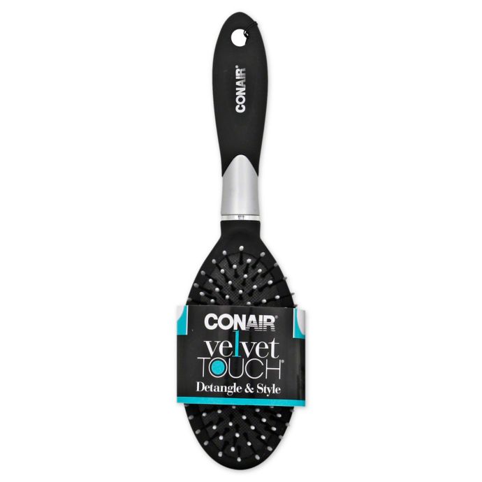 The Conair Velvet Touch Cushion Base Brush features a flexible cushioned base and a soft touch handle. It has ball-tipped bristles that don't snag or pull hair. It's a great everyday brush for detangling and styling all hair lengths.