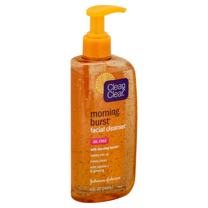 - Clean and Clear Morning Burst Skin Brightening Facial Cleanser is bursting with Vitamin C and Ginseng