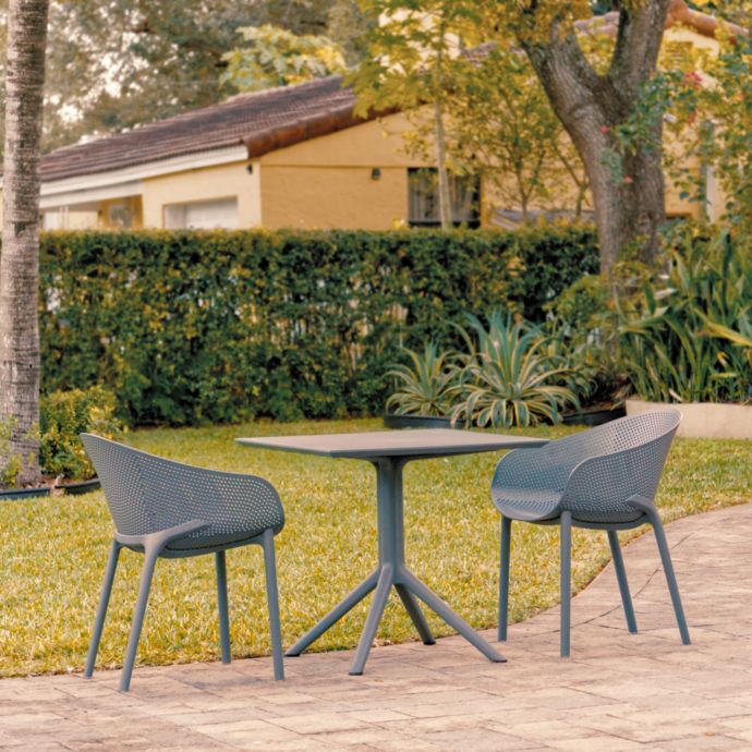 The modern, dining chairs and square table in dark gray are suitable for indoors as well as outdoors. They are made from commercial-grade resin and have molded legs, and are very sturdy for outdoor temperatures. You can clean them easily. Place them indoors or outdoors for visitors or guests for heavy use.