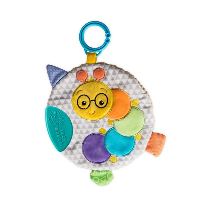 The Baby Einstein Cal Chime Ball by Mary Meyer has a colorful design that encourages sensory exploration. Clip the plush toy to your stroller so your little one has access to the teether to soothe sore gums. Toy also makes squeaker sounds.
