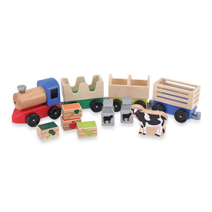 Your little one will love imagining transporting a new cow, cans of milk or fruit and vegetable crates to market with this wooden train. Your young engineer's imagination will be engaged by the colorful engine and the three interchangeable cars.