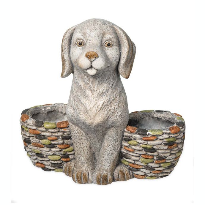 Let this cute pup present your plants! Just fill our Faux Stone Dog Statue Planter with 3" pots of real or faux herbs, flowers or succulents for a delightful display. Weatherproof polymer won't fade, chip, crack or freeze. It has the look, texture and details of real stone, but it's made to use indoors or out in any season. Placed indoors, you can even use this planter to hold candy or small items. Let this charming little dog brighten your day! Plants not included. Weatherproof polymer looks like stone Dog statue with two planter containers Fill with herbs, succulents or flowers Holds two 3" pots of real or faux plants (not included) All-weather construction won't fade, chip, crack or freeze