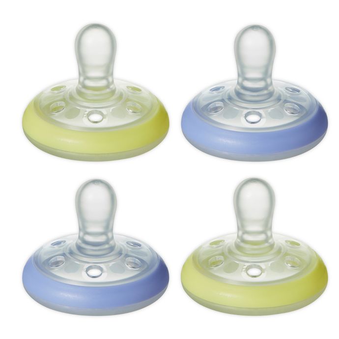 Soothe your little one in between feedings with the Tommee Tippee Breast-Like Night Pacifiers. With an easy to find glow-in-the dark shield, this set of 4 pacifiers are crafted from ultra-soft silicone for a natural soothing experience.