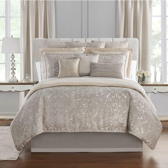 Bring elegant glamour into your private oasis with the Waterford Arianna Bedding Collection. The collection features an oversized blooming medallion jacquard pattern in shades of pearl, ivory, and champagne that provided a lovely update to your space.